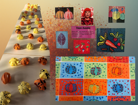 Les œuvres inspirées de Yayoi Kusama ont plongé les élèves dans un monde de pois, de répétitions et de couleurs. Les enfants ont découvert le plaisir de remplir l’espace, de créer des motifs et de composer collectivement, donnant naissance à des réalisations joyeuses et dynamiques.